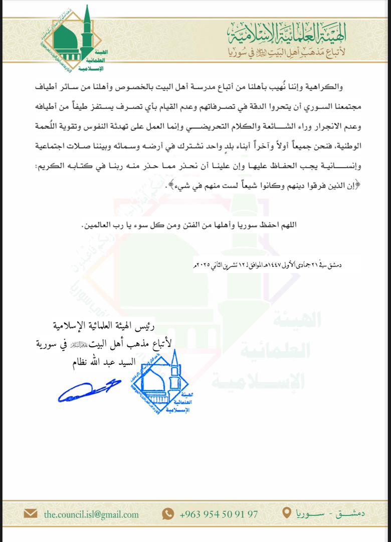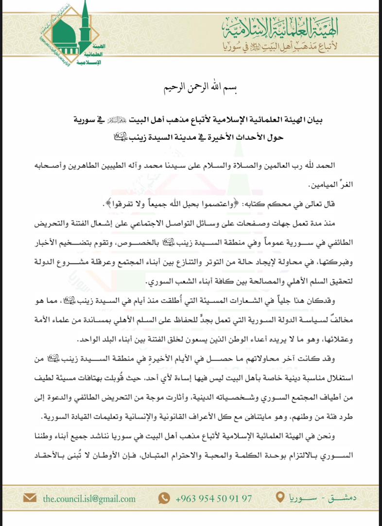 بيان الهيئة العلمائية الإسلامية لمذهب أهل البيت في سوريا حول الأحداث الأخيرة في مدينة السيدة زينب عليها السلام